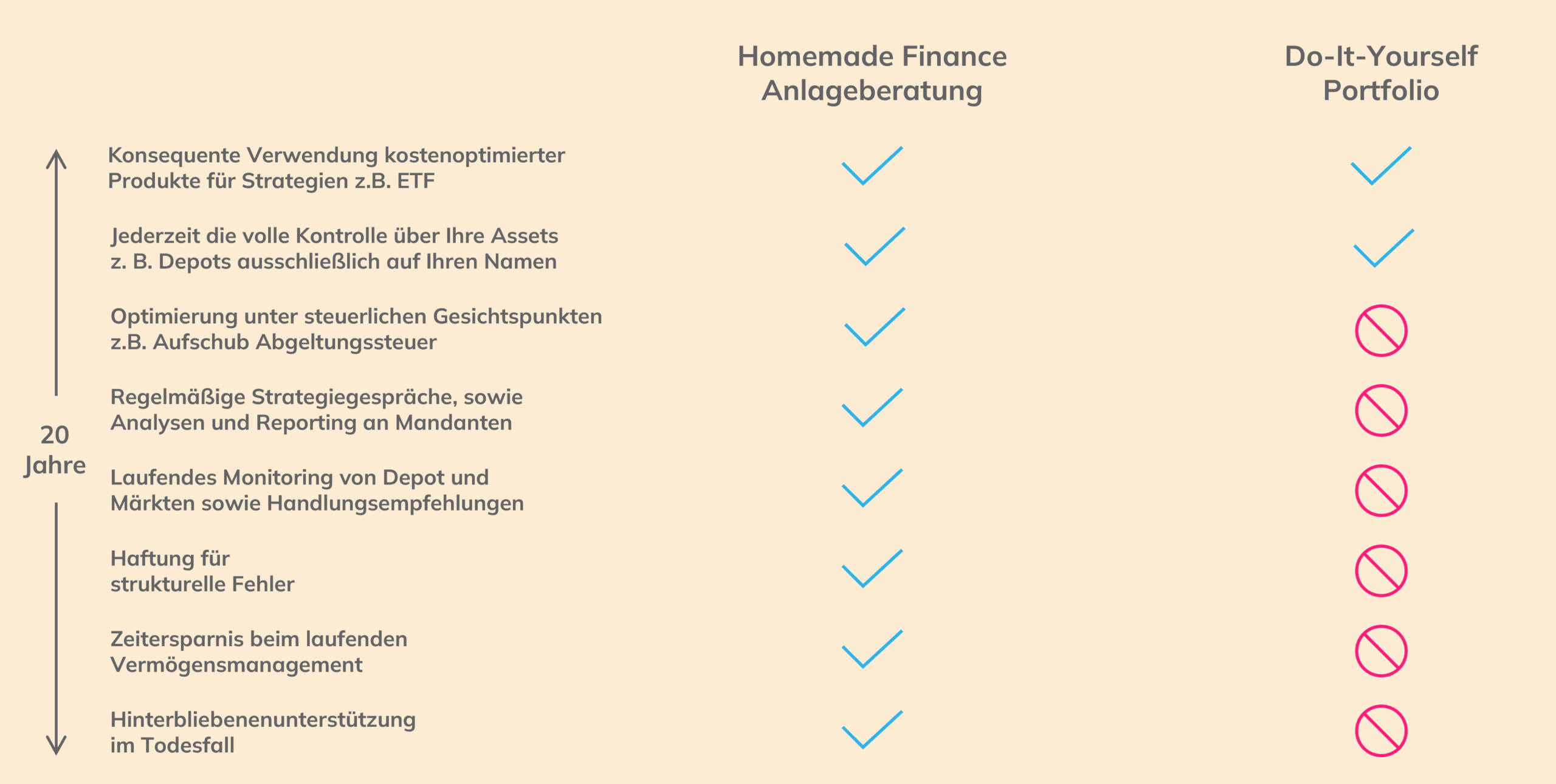 Daher ist Homemade Finance per Definition keine Honorarberatung im Sinne des Gesetzgebers, auch wenn wir die direkte Vergütung als Zusammenarbeitsmodell unseren Mandanten ebenfalls anbieten.